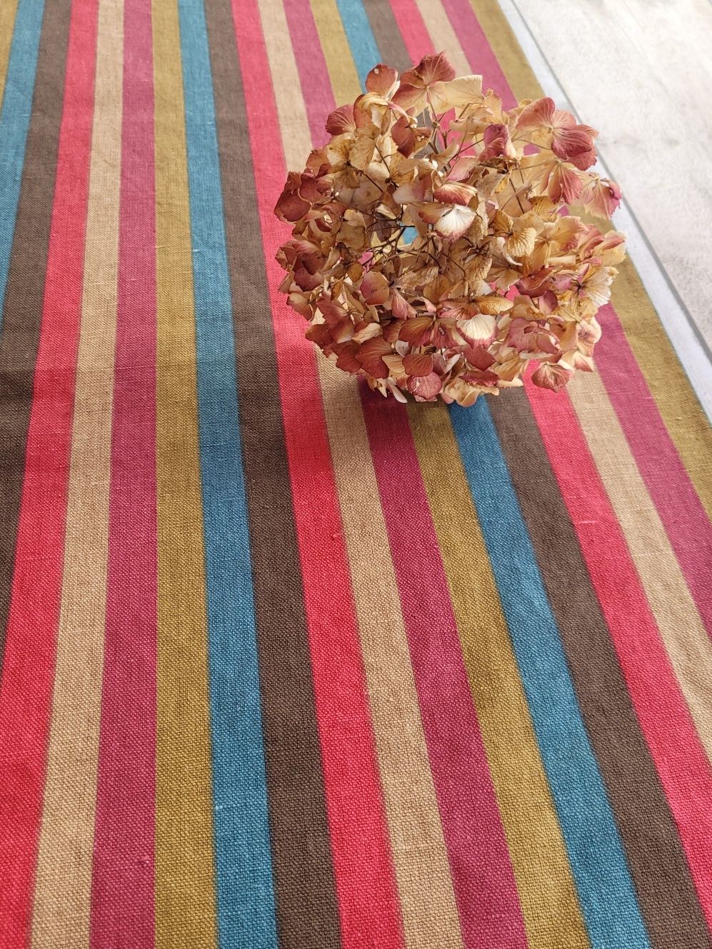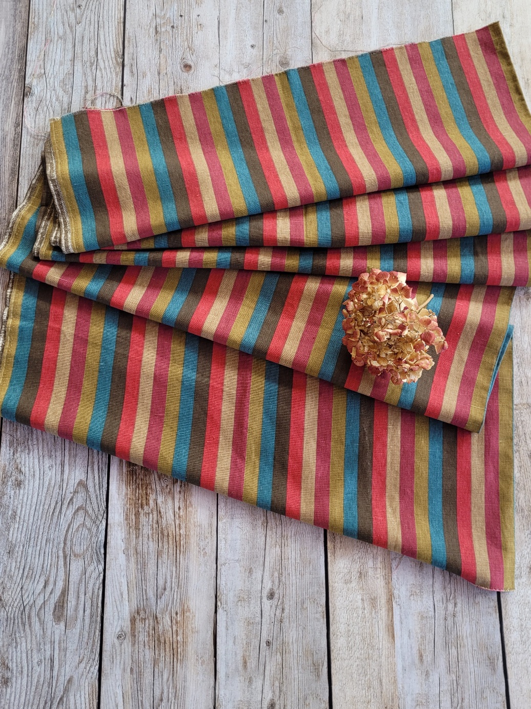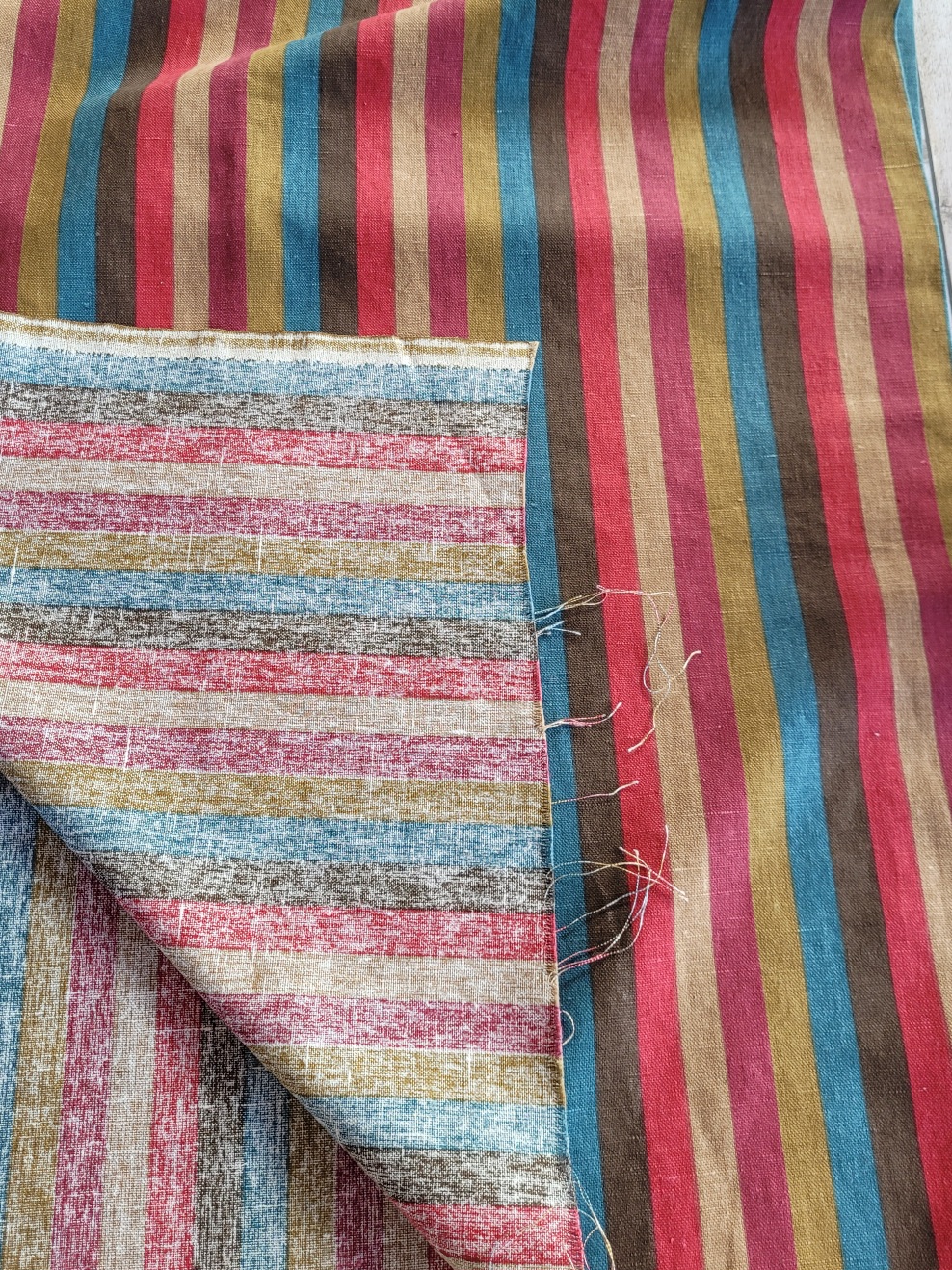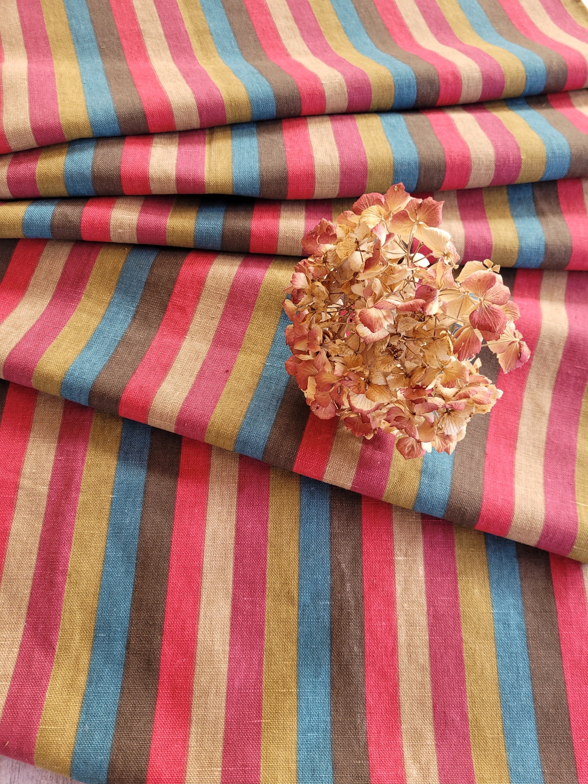 Un beau lin rayé bleu, marron, olive, beige, framboise et cerise