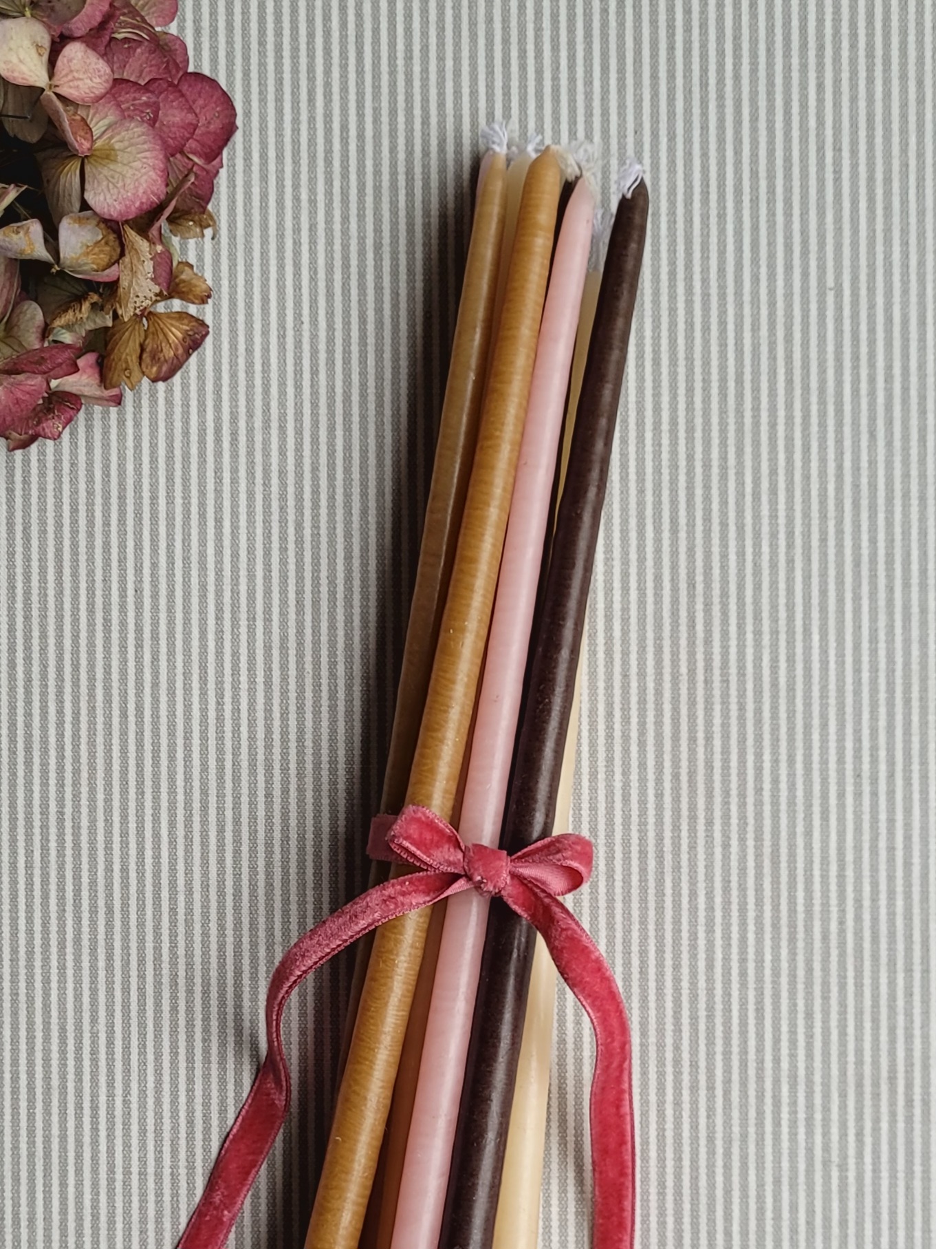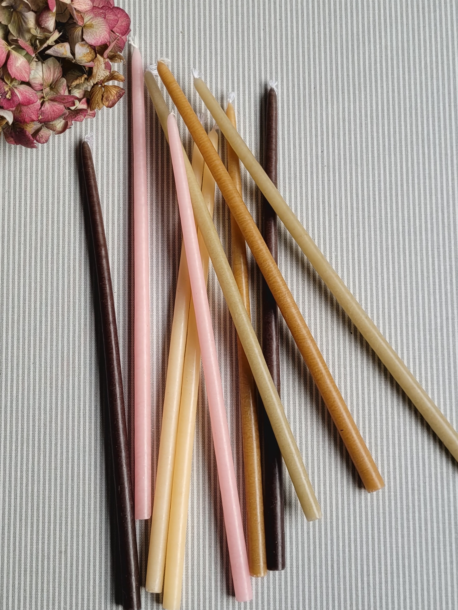 (cire d’abeille, cire végétale, cire minérale, pigments naturels, huiles essentielles, mèches de coton tressé…)