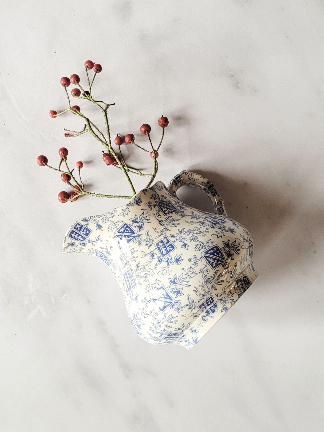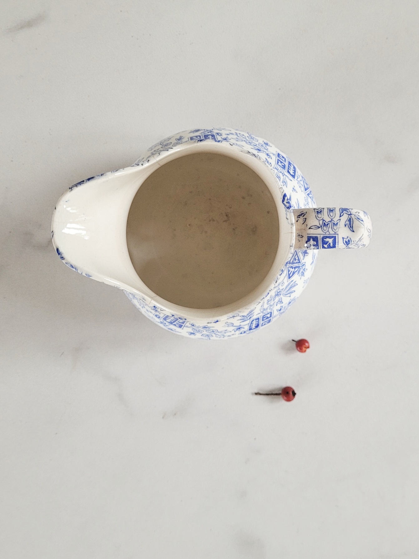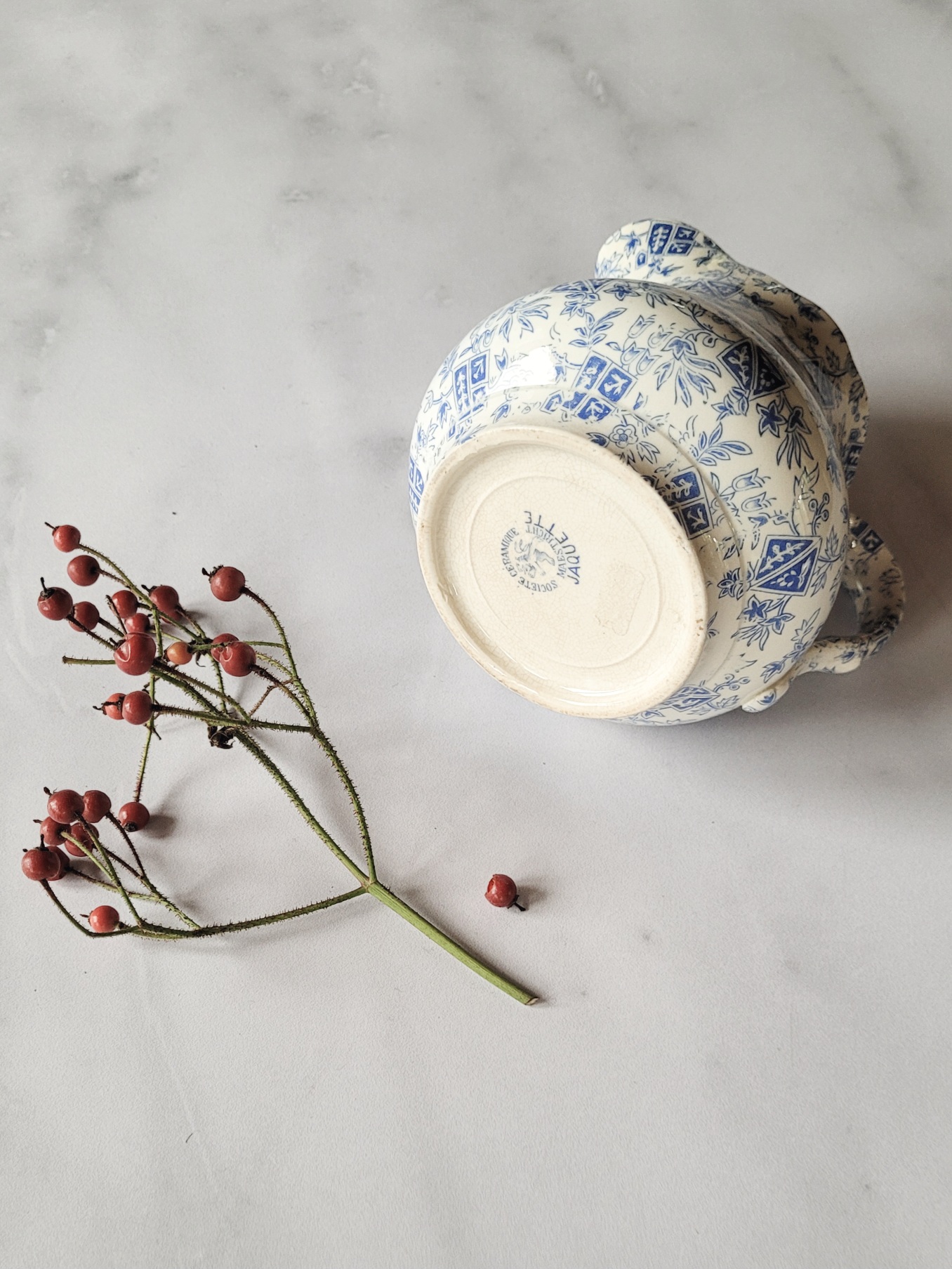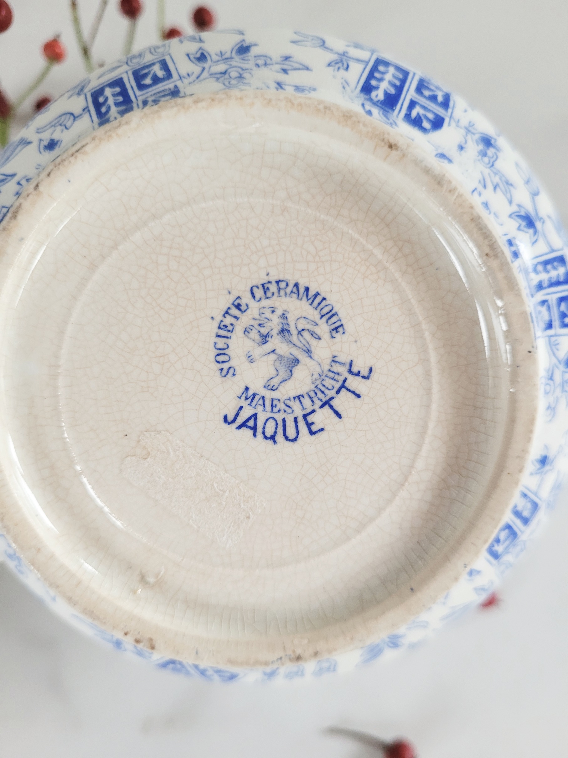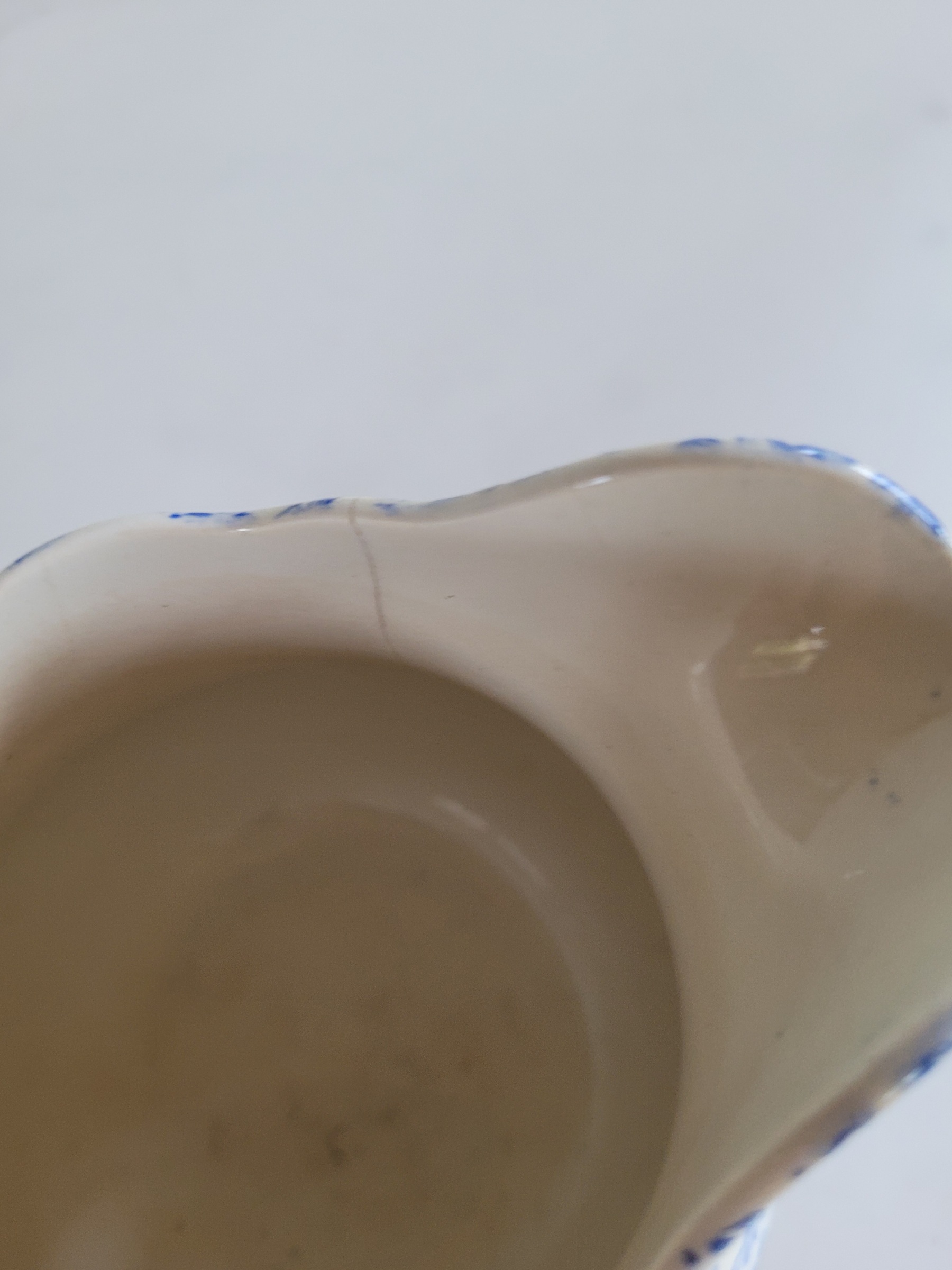 En bon état, traces d’usage et du temps, faïence légèrement patinée et craquelée, à noter 2 fêles de chaque côté qui ne bougent pas et un petit cheveu à l’arrière