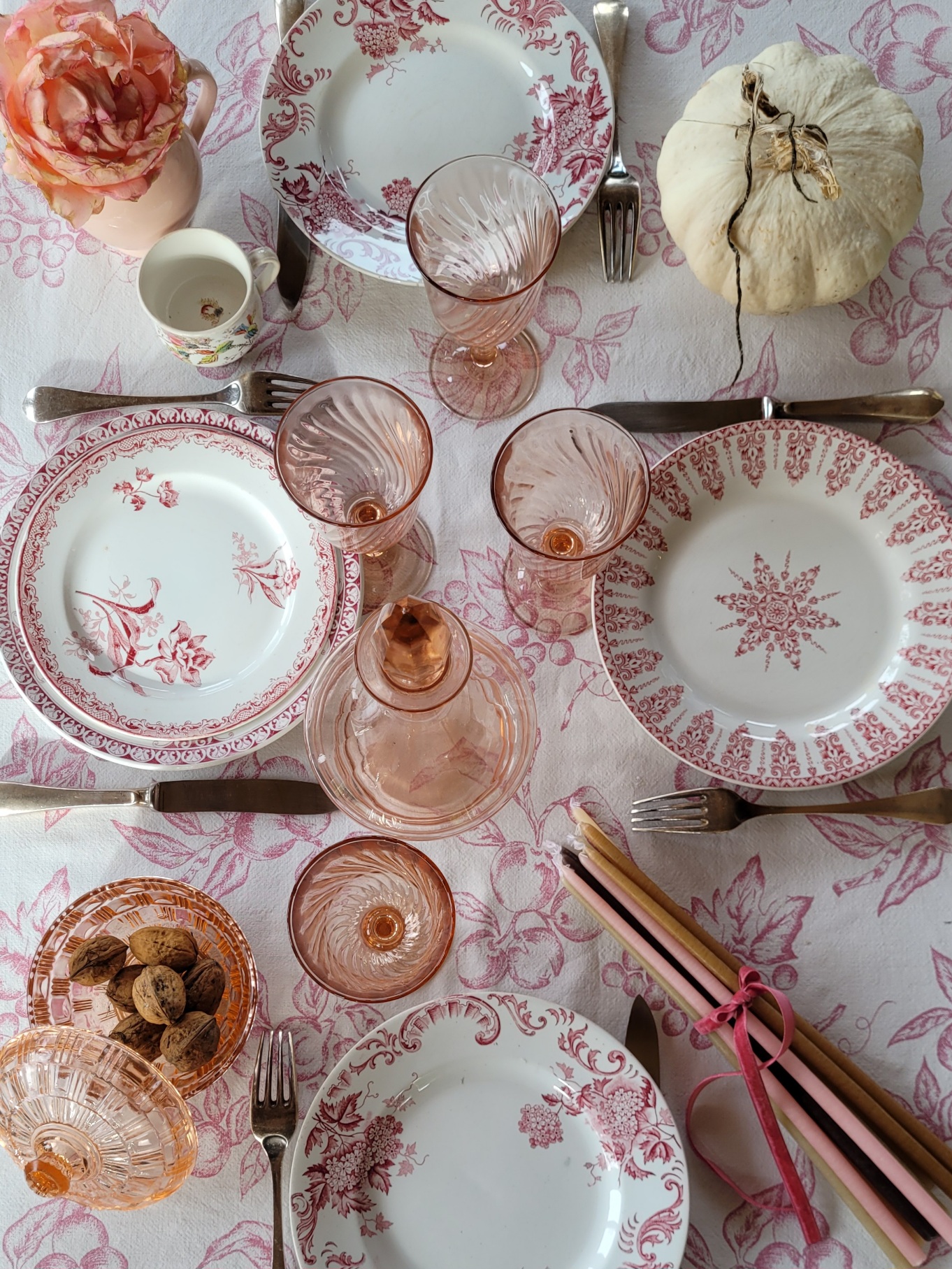 Un bel ensemble pour une table de fête dans des tons de rose et rouge