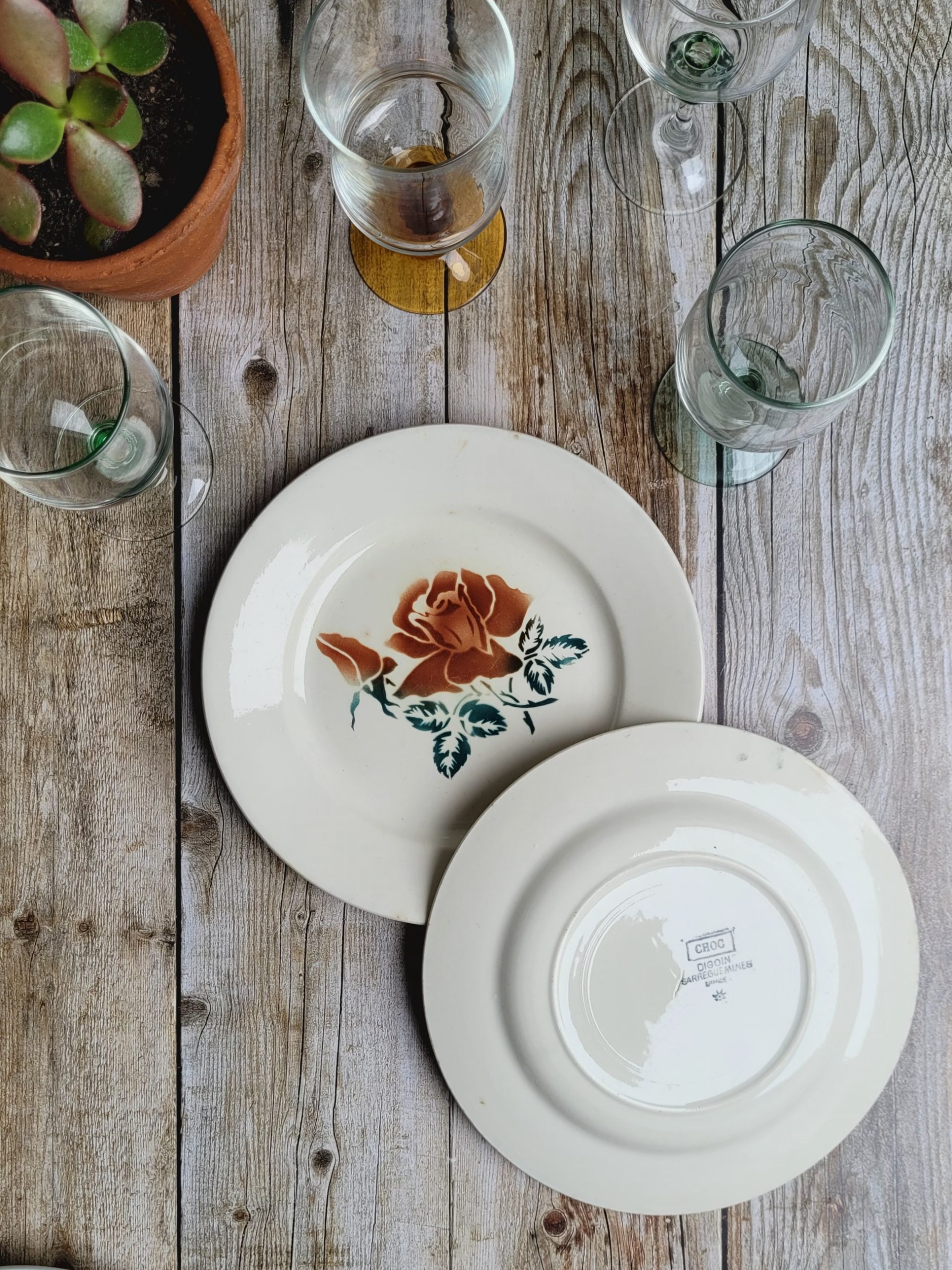 2 Choc/Digoin avec au centre la fameuse rose Digoin déclinée en vert et sépia