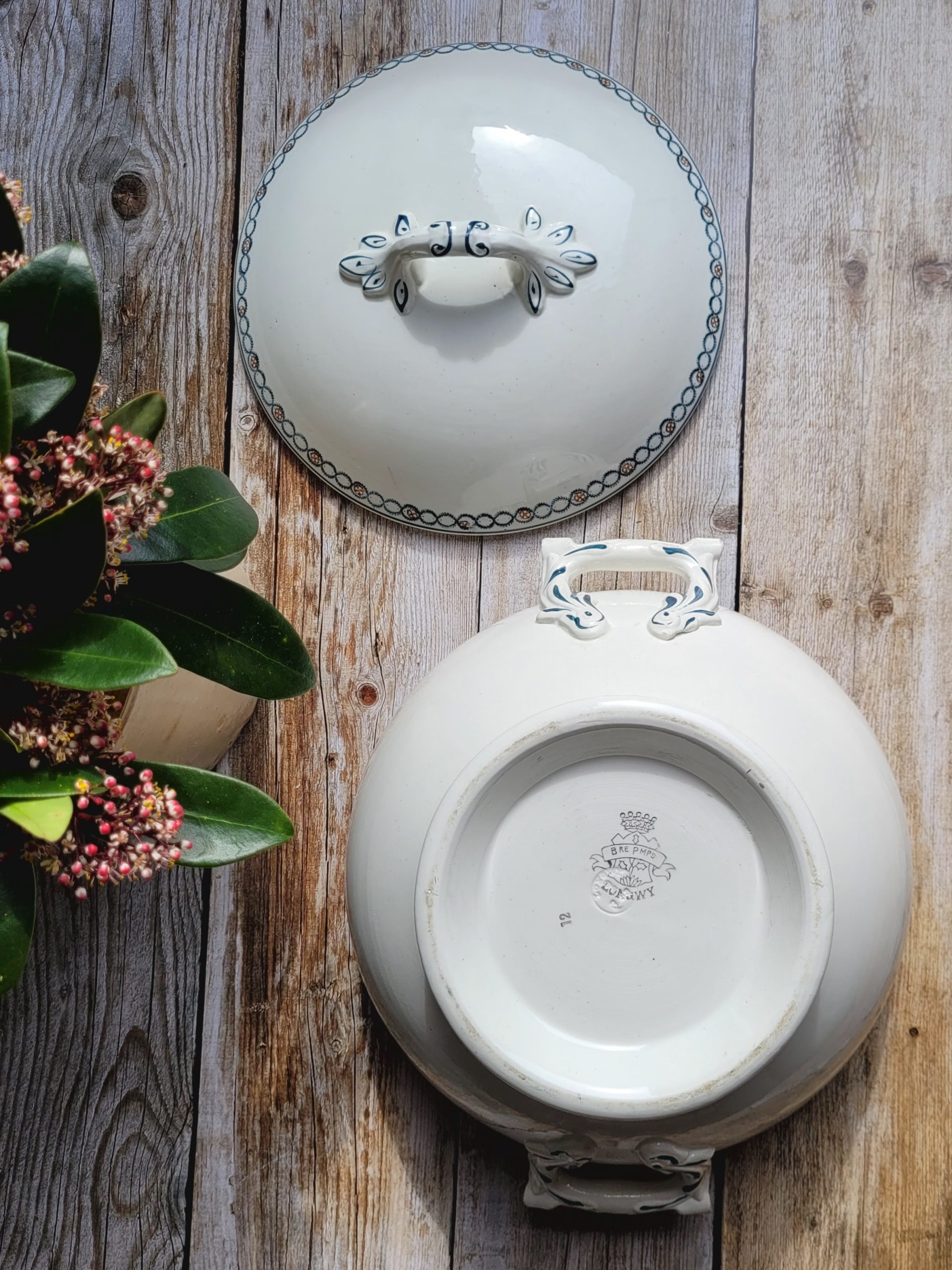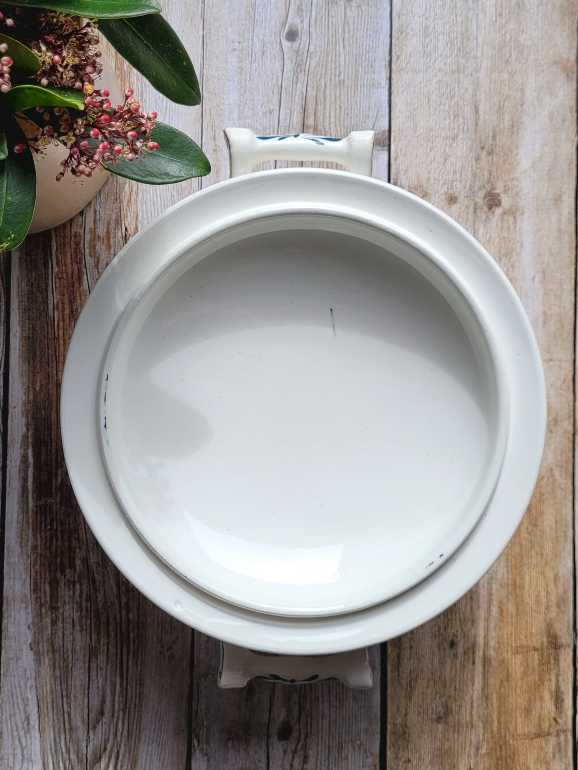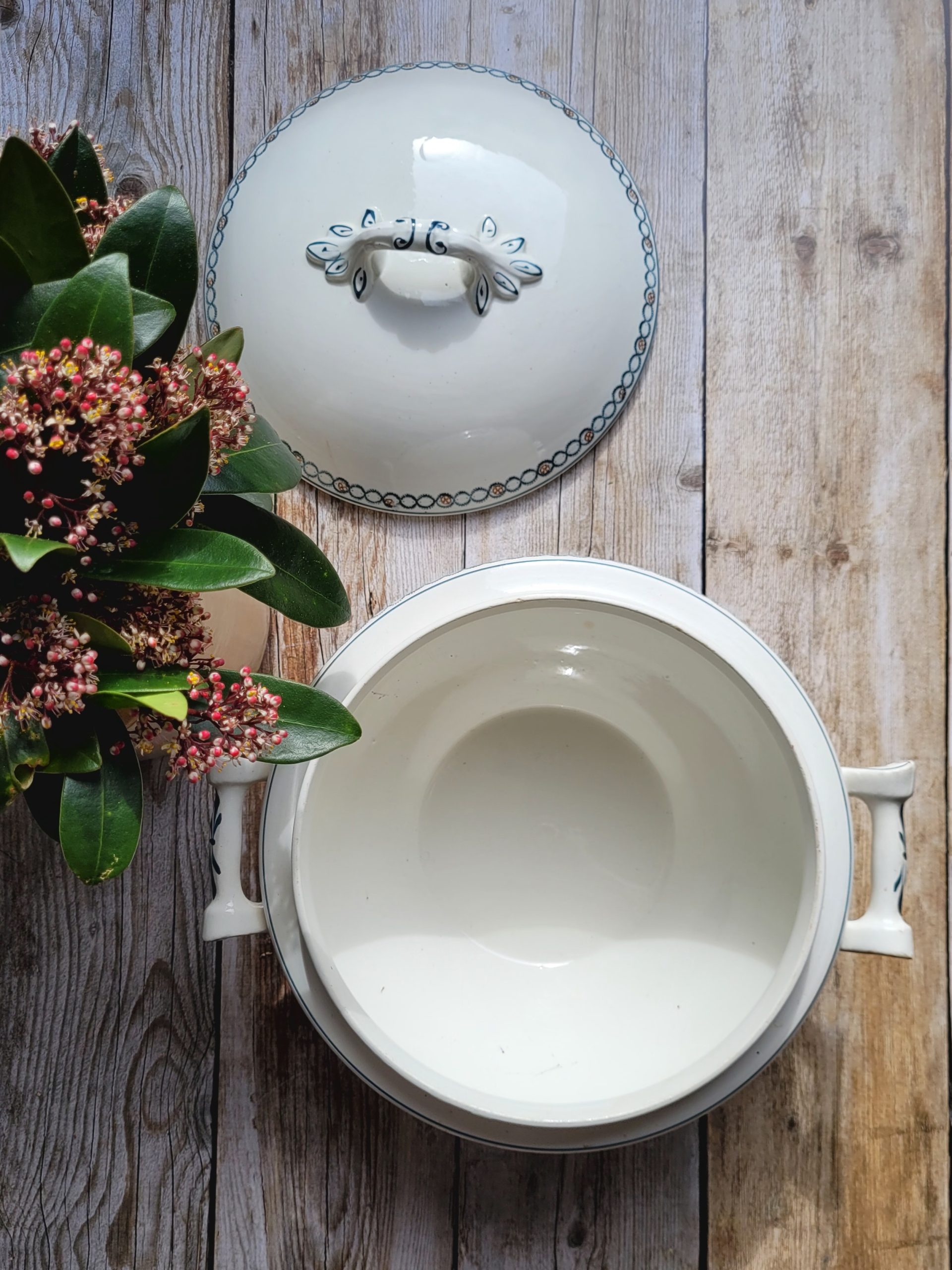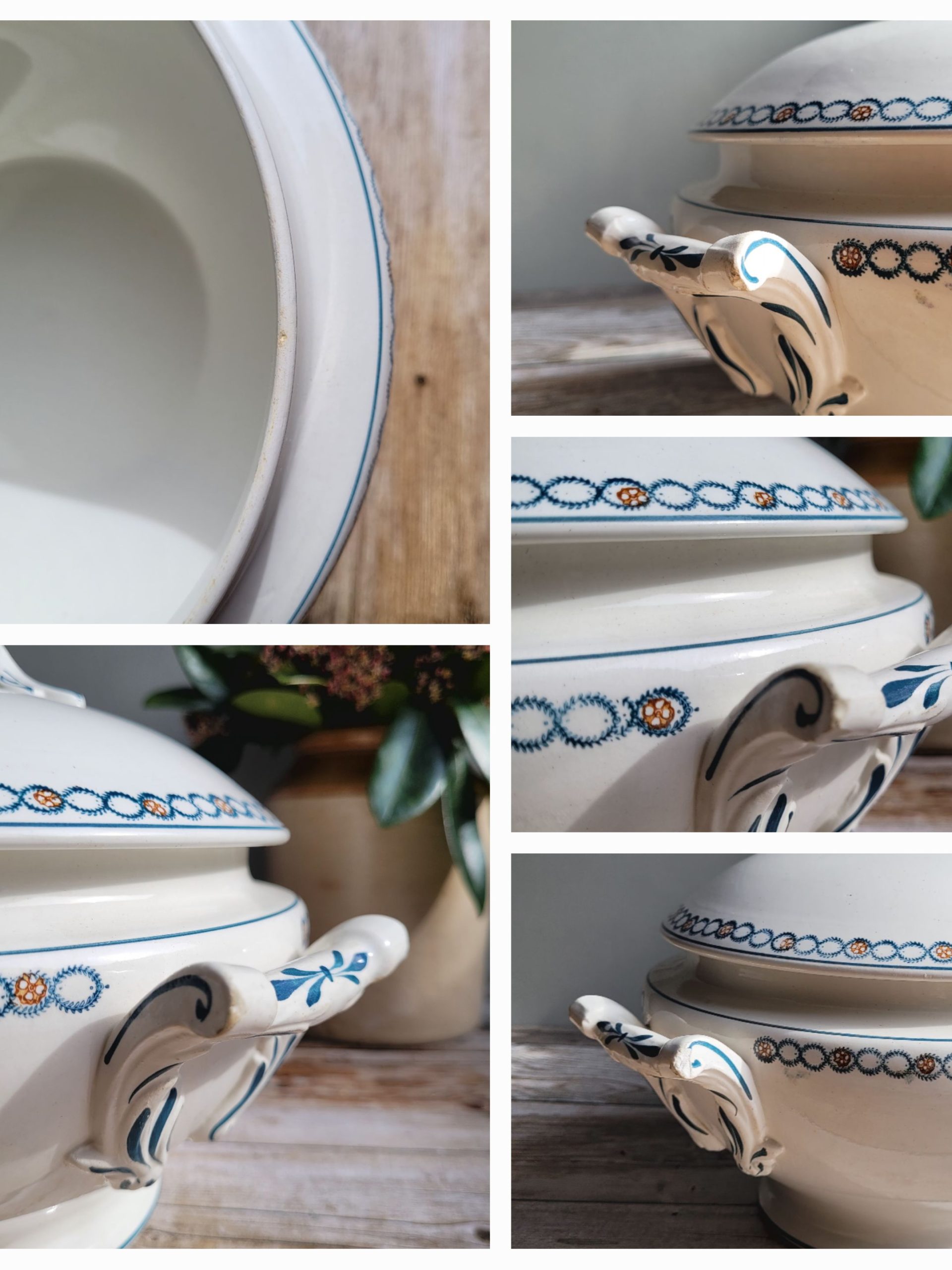 Un petit éclat sur le rebord intérieur de la soupière et sur les anses